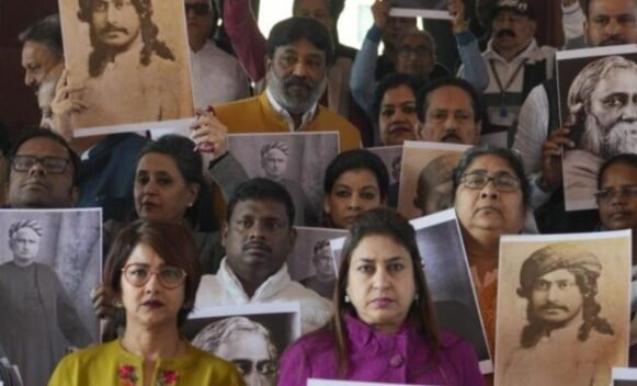 ਨਵੀਂ ਦਿੱਲੀ, 10 ਦਸੰਬਰ (ਨਿਊਜ਼ ਟਾਊਨ ਨੈਟਵਰਕ) : ਤ੍ਰਿਣਮੂਲ ਕਾਂਗਰਸ ਦੇ ਸੰਸਦ ਮੈਂਬਰਾਂ ਨੇ ਮੰਗਲਵਾਰ ਨੂੰ ‘ਵੰਦੇ ਮਾਤਰਮ’ ਉਤੇ ਚਰਚਾ ਦੌਰਾਨ ਭਾਰਤੀ ਜਨਤਾ ਪਾਰਟੀ (ਭਾਜਪਾ) ਵਲੋਂ ਬੰਗਾਲ ਦੇ ਨਾਇਕਾਂ ਦਾ ਅਪਮਾਨ ਕਰਨ ਦੇ ਵਿਰੋਧ ’ਚ ਸੰਸਦ ਦੇ ਕੇਂਦਰੀ ਹਾਲ ’ਚ ਚੁੱਪ ਪ੍ਰਦਰਸ਼ਨ ਕੀਤਾ। ਬੰਗਾਲ ਦੇ ਨਾਇਕਾਂ ਗੁਰੂਦੇਵ ਰਬਿੰਦਰਨਾਥ ਟੈਗੋਰ ਅਤੇ ਬੰਕਿਮ ਚੰਦਰ ਚੈਟਰਜੀ ਦੀਆਂ ਤਸਵੀਰਾਂ ਫੜ ਕੇ ਸੰਸਦ ਮੈਂਬਰਾਂ ਨੇ ਕੇਂਦਰੀ ਹਾਲ ਵਿਚ ਬੈਠ ਕੇ ਅਤੇ ਬਾਅਦ ਵਿਚ ਸੰਵਿਧਾਨ ਸਭਾ ਦੇ ਗੇਟ ਉਤੇ ਖੜ੍ਹੇ ਹੋ ਕੇ ‘ਚੁੱਪ ਵਿਰੋਧ ਪ੍ਰਦਰਸ਼ਨ’ ਕੀਤਾ। ਪ੍ਰਧਾਨ ਮੰਤਰੀ ਨਰਿੰਦਰ ਮੋਦੀ ਵਲੋਂ ਸ਼ੁਰੂ ਕੀਤੀ ਗਈ ‘ਵੰਦੇ ਮਾਤਰਮ’ ਦੇ 150 ਸਾਲ ਪੂਰੇ ਹੋਣ ਉਤੇ ਲੋਕ ਸਭਾ ’ਚ ਚਰਚਾ ਤੋਂ ਇਕ ਦਿਨ ਬਾਅਦ ਇਹ ਵਿਰੋਧ ਪ੍ਰਦਰਸ਼ਨ ਕੀਤਾ ਗਿਆ ਹੈ। ਰਾਜ ਸਭਾ ’ਚ ਤ੍ਰਿਣਮੂਲ ਦੀ ਉਪ ਨੇਤਾ ਸਾਗਰਿਕਾ ਘੋਸ਼ ਨੇ ਦੋਸ਼ ਲਾਇਆ, ‘‘ਕੱਲ੍ਹ ‘ਵੰਦੇ ਮਾਤਰਮ’ ਉਤੇ ਹੋਈ ਬਹਿਸ ’ਚ ਪ੍ਰਧਾਨ ਮੰਤਰੀ ਨਰਿੰਦਰ ਮੋਦੀ ਨੇ ਬੰਗਾਲ ਦੇ ਸਾਹਿਤਕਾਰ ਬੰਕਿਮ ਚੰਦਰ ਚੈਟਰਜੀ ਅਤੇ ਸਾਡੇ ਮਹਾਨਾਇਕ ਰਬਿੰਦਰਨਾਥ ਟੈਗੋਰ ਦਾ ਅਪਮਾਨ ਕੀਤਾ। ਇਹ ਬੰਗਾਲ ਦੇ ਸਭਿਆਚਾਰ ਅਤੇ ਲੋਕਾਂ ਲਈ ਇਕ ਗੰਭੀਰ ਝਟਕਾ ਹੈ।’’ ਉਨ੍ਹਾਂ ਕਿਹਾ ਕਿ ਬੰਕਿਮ ਚੰਦਰ ਚੈਟਰਜੀ ਬੰਗਾਲ ਦੀ ਮਹਾਨ ਸ਼ਖਸੀਅਤ ਹਨ ਅਤੇ ਉਨ੍ਹਾਂ ਨੇ ‘ਆਨੰਦਮਠ’ ਦੀ ਰਚਨਾ ਕੀਤੀ ਜਿਸ ਤੋਂ ‘ਵੰਦੇ ਮਾਤਰਮ’ ਉਤਪੰਨ ਹੋਈ ਹੈ। ਘੋਸ਼ ਨੇ ਦੋਸ਼ ਲਾਇਆ ਕਿ ਉਨ੍ਹਾਂ ਦੇ ਨਾਮ ਵੀ ਗਲਤ ਉਚਾਰਨ ਕੀਤਾ ਗਿਆ ਸੀ ਅਤੇ ਉਸ ਦੇ ਯੋਗਦਾਨ ਨੂੰ ਗਲਤ ਢੰਗ ਨਾਲ ਪੇਸ਼ ਕੀਤਾ ਗਿਆ ਸੀ। ਤ੍ਰਿਣਮੂਲ ਦੇ ਸੰਸਦ ਮੈਂਬਰਾਂ ਨੇ ਬੰਗਾਲ ਦੇ ਸਭਿਆਚਾਰਕ ਨਾਇਕਾਂ ਦੇ ਅਪਮਾਨ ਲਈ ਪ੍ਰਧਾਨ ਮੰਤਰੀ ਮੋਦੀ ਤੋਂ ਮੁਆਫੀ ਮੰਗਣ ਦੀ ਮੰਗ ਕੀਤੀ। ਜ਼ਿਕਰਯੋਗ ਹੈ ਕਿ ਟੀ.ਐਮ.ਸੀ. ਨੇ ਮੋਦੀ ਉਤੇ ਲੋਕ ਸਭਾ ਵਿਚ ‘ਵੰਦੇ ਮਾਤਰਮ’ ਉਤੇ ਬਹਿਸ ਦੌਰਾਨ ਚੈਟਰਜੀ ਨੂੰ ‘ਬੰਕਿਮ ਦਾ’ ਕਹਿ ਕੇ ਉਨ੍ਹਾਂ ਦਾ ਅਪਮਾਨ ਕਰਨ ਦਾ ਦੋਸ਼ ਲਾਇਆ ਸੀ। ਤ੍ਰਿਣਮੂਲ ਦੇ ਸੀਨੀਅਰ ਸੰਸਦ ਮੈਂਬਰ ਸੌਗਤਾ ਰਾਏ ਨੇ ਕਿਹਾ ਕਿ ਉਨ੍ਹਾਂ ਨੂੰ ‘ਬੰਕਿਮ ਬਾਬੂ’ ਕਿਹਾ ਜਾਣਾ ਚਾਹੀਦਾ ਹੈ। ਮੋਦੀ ਨੇ ਤੁਰਤ ਇਸ ਦਾ ਸਤਿਕਾਰ ਕੀਤਾ ਅਤੇ ਕਿਹਾ, ‘‘ਮੈਂ ਬੰਕਿਮ ਬਾਬੂ ਕਹਾਂਗਾ। ਤੁਹਾਡਾ ਧੰਨਵਾਦ, ਮੈਂ ਤੁਹਾਡੀਆਂ ਭਾਵਨਾਵਾਂ ਦਾ ਆਦਰ ਕਰਦਾ ਹਾਂ।’’