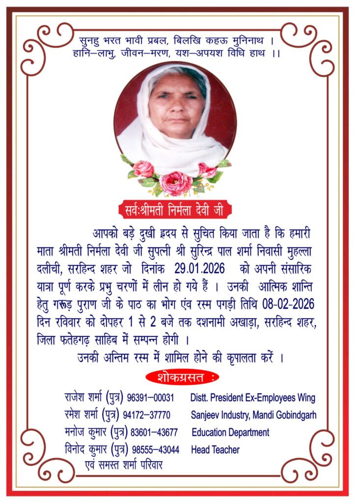 ਸਮਾਜ ਸੇਵੀ ਅਤੇ ਸਾਬਕਾ ਸੁਪਰਡੈਂਟ ਰਾਜੇਸ਼ ਸ਼ਰਮਾ ਦੀ ਮਾਤਾ ਨਿਰਮਲਾ ਦੇਵੀ ਦੀ ਆਤਮਿਕ ਸ਼ਾਂਤੀ ਲਈ ਰੱਖੇ ਸ਼੍ਰੀ ਗਰੁੜ ਪੁਰਾਣ ਜੀ ਦੇ ਪਾਠ ਦੇ ਭੋਗ ਅਤੇ ਰਸਮ ਪਗੜੀ 8 ਫਰਵਰੀ ਨੂੰ ਦਸ਼ਨਾਮੀ ਅਖਾੜਾ ਸਰਹਿੰਦ ਵਿਖੇ 1 ਤੋਂ 2 ਵਜੇ ਤੱਕ ਹੋਵੇਗੀ।